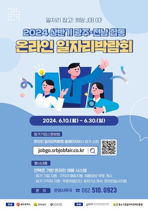 전라남도는 오는 10일부터 30일까지 ‘일자리 잡고! 희망 JOB GO!’라는 주제로 ‘2024 상반기 전남·광주 합동 온라인 일자리박람회’를 개최한다고 밝혔다.이번 온라인 일자리 박람회는 전남·광주 기업에 우수 인재를 공급하고, 구직자에게 다양한 고용 정보와 취업 기회를 제공하기 위해 전남도와 광주시, 광주전남지방중소벤처기업청이 함께 주최하고 전남중소기업일자리경제진흥원과 광주경제진흥상생일자리재단이 공동 주관한다.전남·광주지역 150여 기업이 참가해 80명 취업 연계를 목표로 하는 초광역 온라인 채용의 장이 될 전망이다.박람회 참가