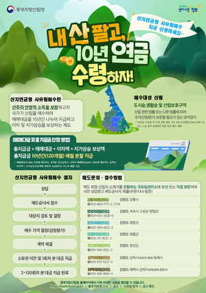동부지방산림청(청장 최수천)은 금년도 약 15억원의 예산을 투입하여 146ha의 사유림 매수를 추진하고 있으며, 해당 매수 면적은 약 228개의 축구장 크기에 달한다.그중 「산지연금형 사유림매수」는 2021년부터 산림청에서 새롭게 도입한 제도로, 산림관계 법률에 따라 행위가 제한된 공익임지(백두대간보호구역, 산림보호구역 등)를 대상으로 국가가 개인의 산림을 매입하고 그 매매대금을 10년간 매월 일정금액으로 분할 지급함으로써 임지를 매도한 산주의 안정적인 생활자금을 보장하는 제도이다.「산지연금형 사유림매수」는 2인(토지거래계약 허가구