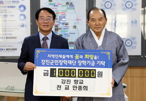 풍요의 계절 10월, 강진군민장학재단에 미래인재 육성 장학금을 기탁하는 뜻깊은 자리가 마련됐다. 지난 22일 강진향교 안종희 전교, 성균관유도회 강진군지부 김기조 회장이 각각 100만원을 강진군민장학재단에 기탁했다.강진군 강진읍 동성리에 있는 강진향교는 전라남도 유형문화재 제115호로 지정됐으며 현유(賢儒)의 위패를 봉안, 배향하고 지방의 중등교육과 지방민의 유학교육과 교화를 위해 조선 전기에 창건된 향교다. 강진향교 안종희 전교는 ”부모에 대한 효와 올바른 인성으로 의를 수행해 지역사회 및 국가의 훌륭한 인재로 나아갈 수 있도록