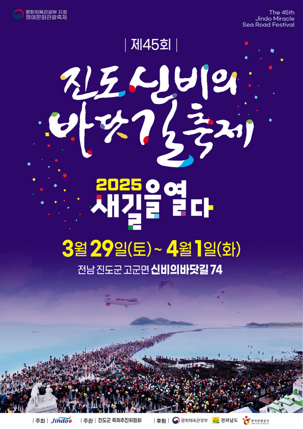 푸른 바다 위를 가르는 새 길, 자연과 예술이 만나는 그곳, ‘2025 진도 신비의 바닷길 축제’가 올해도 어김없이 진도군 고군면 일원에서 3월 29일부터 4월 1일까지 4일간 성대하게 펼쳐진다.